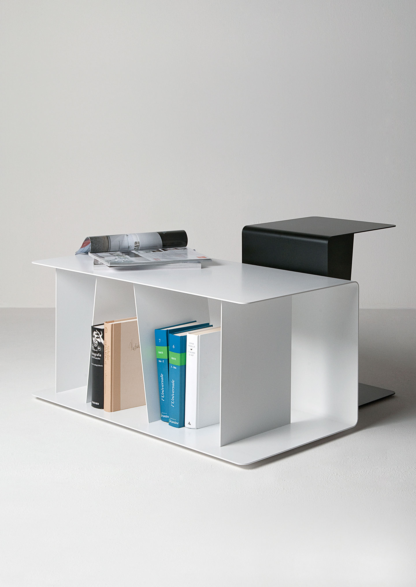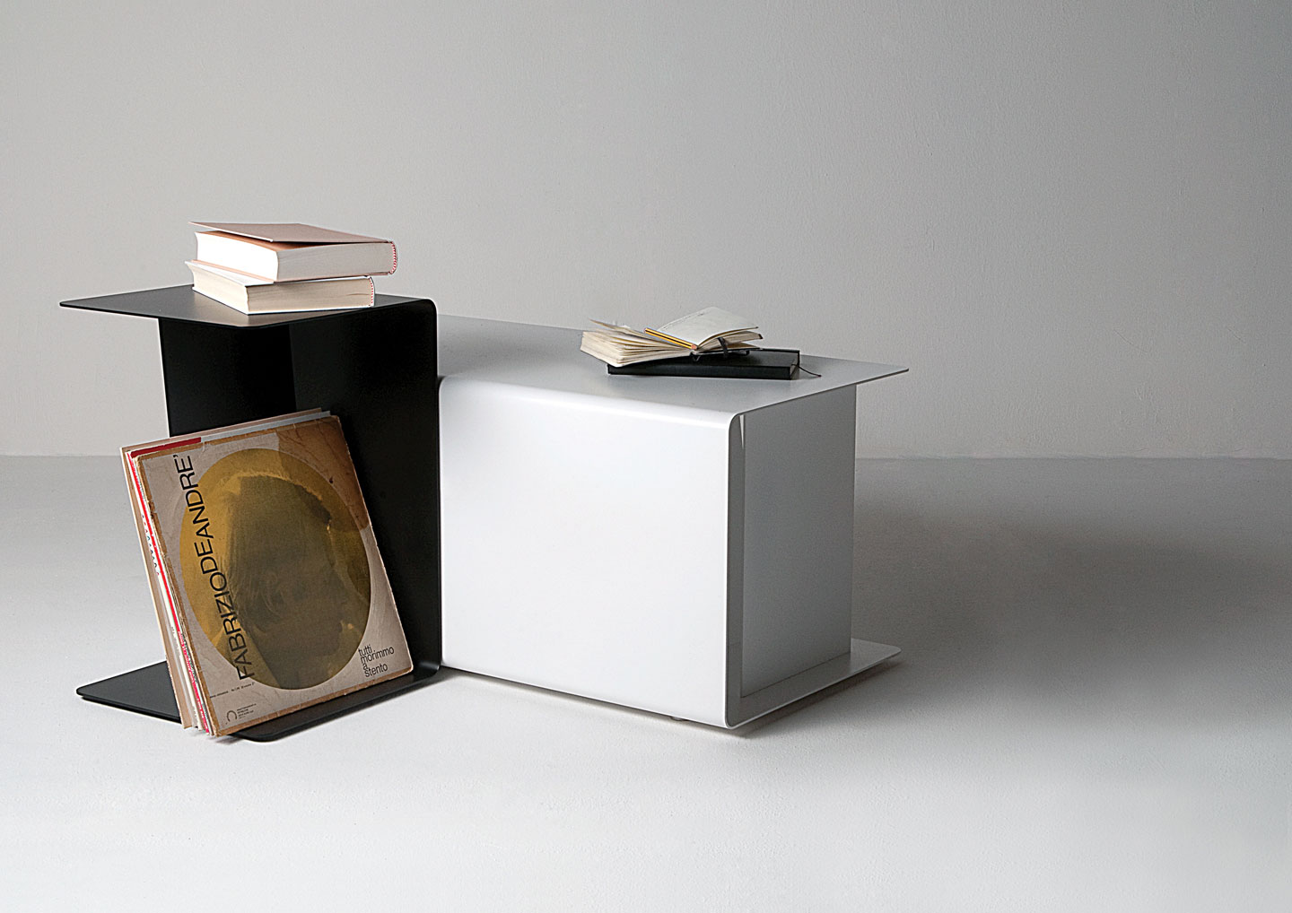 Tavolino porta riviste in lamiera di metallo verniciato.